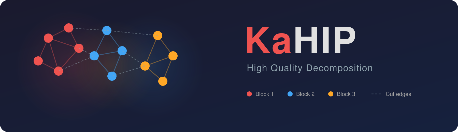 Graph Partitioning -- divide a graph into k balanced blocks while minimizing the edges cut between them. NP-hard and central to parallel computing, VLSI design, scientific simulations, sparse matrix factorization, and route planning. Our tools range from high-quality multilevel methods with evolutionary search, to shared-memory and distributed-memory parallel partitioners, to streaming algorithms for graphs that do not fit in memory.